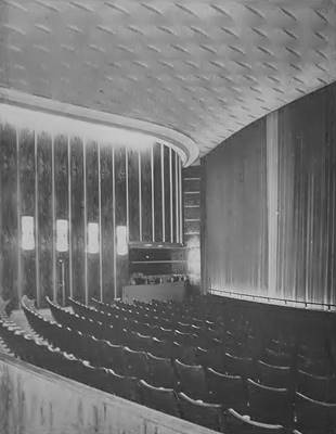 Büroräume, Wohnungen und eine Cafeteria im 6. Obergeschoß. Um in das Theater zu gelangen, musste man sich über eine breite Treppe durch breite Glasportieren in die im Souterrain gelegene großräumige Kassenhalle - gleichzeitig Windfang - begeben. Von hier aus führte der Weg wiederum durch breite Glasportieren in ein geschmackvolles Foyer, dem sich die Garderoben (jeder Besucher erhielt das seiner Platznummer entsprechende „Spind“) und sanitären Einrichtungen anschlossen. Über zwei Seitenaufgänge stieg man dann in die repräsentative Wandelhalle. Auch hier stach sofort der Geschmack des Bauherrn für künstlerische Besonderheiten (Drahtplastiken, Kunstschmiedearbeiten usw.) ins Auge. Eine Sitztheke stellte eine Direktverbindung zum Restaurant her. Gestaltung und Ausstattung des 39 m langen. 22 m breiten und 9 m hohen Theatersaales, in dem man über Seitengänge gelangte, waren beispiellos im Saarland. Während sich graue Regips-Akustikplatten in Wellenform über die Decke zogen, verkleideten Persisch-Nußbaum im Sägeschnitt und Makassar die Wände. Murano-Glasleuchter und indirekte Deckenbeleuchtung dienten als wohltemperierte Lichtspender. Der Saal bot 760 Flachpolsterstühle in drei Farben für Filmvorführungen und 850 Plätze für Theateraufführungen (Gastspiele der Stadttheater Saarbrücken und Trier, des Saarländischen Landestheaters usw.). Die Loge befand sich in der Mitte des Raums; das im rückwärtigen Teil stufenartig angelegte Hochparkett erhob sich bis 4 m über Bühnenvorderkante. Die kino- und tontechnischen Maschinen und Geräte wurden vom Bauherrn in eigener Regie durch seinen Kinotechniker Schmalenbach montiert. Mit den zwei Bauer - Universal - Projektoren der Type „U 2“ konnten Filme im 35- und 70-mm-Format vorgeführt werden. Die Maschinen waren mit Xenonlampen 2000 W ausgerüstet. Eine „Perlux-Harkness“-Bildwand in den Dimensionen 15,5 x 7,5 m bei Todd-AO und 14 x 5,80 m bei CinemaScope-Magnetton war in Bogenform auf ein Eisenkonstruktions-Bildwandrahmengestell gespannt. Bei Bühnenaufführungen wurde dieses Gestell in einen oberhalb des Bühnenportals gelegenen Schacht hochgezogen. Auf den Bildwandrahmen fest montiert waren fünf Klangfilm-Eurodyn Lautsprecher -Kombinationen“ mit akustischer Linse. 32 Effekt-Lautsprecher waren im Zuschauerraum, vornehmlich an der Decke, verteilt. Ein Bauer-Dia-Projektor mit Hochintensitäts - Bogenlampe, eine Klangfilm-Schwerhörigenanlage, ein Tonbandgerät, elektro- automatischer Gong, Plattenspieler und eine Mikrophonanlage gehörten zur weiteren technischen Ausrüstung. Das Haus war mit einer vollautomatischen Klimaanlage ausgerüstet. Ein im Südtrakt gelegenes Filmstudio (200 Plätze) und das von der Stadt Saarlouis errichtete Bühnenhaus harrten zum Zeitpunkt der Kinoeröffnung noch der Vollendung. Das "Filmstudio" scheint denn auch nie verwirklicht worden zu sein. W5741 N5801 W5841 W5947 E5995 N6023 W6015 Update 2025: In einem Bericht der Fachzeitschrift "Der Neue Film" wird das Filmstudio doch als geöffnet erwähnt. Blickfang im Saal bildete demnach ein zweifarbiger Bühnenvorhang, der fast die gesamte Stirnseite des Raumes einnahm. Dank einer auswechselbaren Bestuhlung konnte der Saal auch für Kammerkonzerte und Tanzveranstaltungen genutzt werden. N6023 W6015 Literatur: „Saarlouis Theater am Ring“, Krüger-Verlag Mehr erfahren Sie hier. Und hier. Und hier. |
