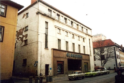 Theater Thüringens“. 1930 wurde das Kino von der Thüringer Lichtspiele GmbH übernommen und von Valentin Widera, Jena, geführt. 1934 bis 1941 lag die Direktion bei Gustav Schneider. K30235 Nach Gründung der DDR wurde es in "Alhambra-Lichtspiele" umbenannt. Die Zahl der Sitzplätze auf 988 reduziert, die Anschrift änderte sich von Johannesstraße 164 in Leninstraße 164. 1985 bis 1990 hieß es "Alhambra Theater". 1991 war die Adresse wieder Johannesstraße 164. Als neuer Träger die "Filmtheater Betriebs GmbH Erfurt" gegründet, die auch das Angerkino betrieb. Im ehemaligen Kohlenkeller wurde ein Mini-Kino eingerichtet. Der kleinere Saal wurde "Intim-Kino Love in“ genannt. Diese Trägergesellschaft wurde 1992 von der Kieft & Kieft Filmtheater GmbH, Lübeck, übernommen, die das Haus bis 1997 betrieb und dann das Gebäude an einen privaten Bauträger verkaufte. Dieser ließ das Haus bis auf die Fassade zur Johannesstraße abreißen und errichtete hinter der alten Fassade und auf dem Nachbargrundstück Johannesstraße 162 ein Büro-Geschäftshaus, in dem u. a. die Verwaltung der Barmer GEK untergebracht wurde. Quelle u.a: Wikipedia |