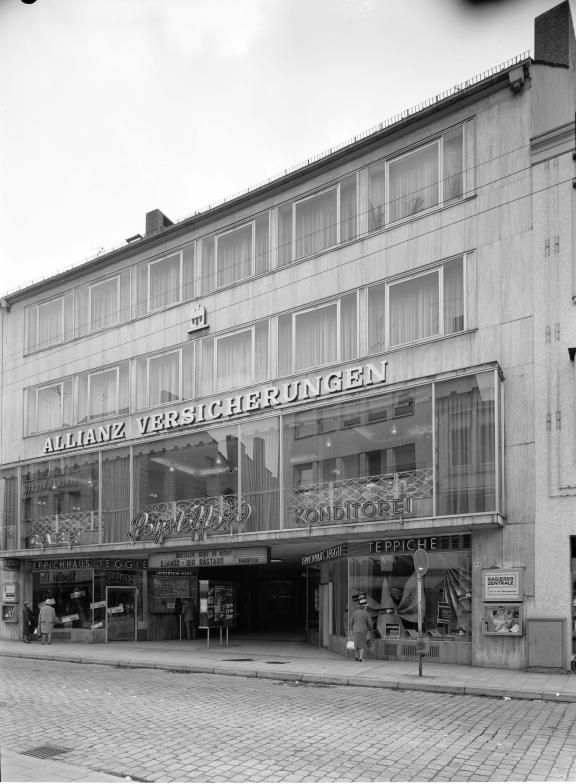 Heinz Reichert, langjähriger Osnabrücker Kino-Kämpe und schon vor dem Krieg Mitbetreiber des "Universums" an gleicher Stelle, eröffnete dann am 7. April 1960 im Allianz-Bau an der Großen Straße sein "Universum“-Theater. Es lag im Erdgeschoß des Neubaus und fasste 386 Besucher, die auf dem schwarzen Gestühl mit rotem Polster bequeme Sitzgelegenheit fanden. Das farblich wirkungsvolle Foyer mit Süßwarenstand und Garderobe führte in den intimen Kinosaal, dessen ovales Rund mit gelbem, feuerfestem und staubabweisendem Damast an den Wänden verkleidet war Die schwarze Verkleidung um die 3,70 mal 9,50 m große Leinwand gab einen geschmackvollen Kontrast dazu. Die Cinemascope- und Breitleinwand wurde durch hellblaue Vorhänge verdeckt, die wiederum eine 15,60 x 4,50 x 4,60 m große Bühnenfläche abschloss. Filzauflage und Kunststoffbelag verbesserten die Akustik, schmiedeeiserne, mit Blattgold überzogene Wandleuchter mit gewölbten Wandschalen sorgten für Auflockerung der Wandflächen. Eine moderne Klimaanlage bewirkte zu jeder Tageszeit angenehme Temperatur und frische Luft. In der Vorführkabine befanden sich zwei Zeiss Ikon-Maschinen mit Xenonlampen. Eine Stereoanlage mit mehreren Lautsprechern. bot den Zuschauern zeitgemäßen Komfort. Architekt Logemann aus Bremen war für den Bau verantwortlich. W6023 1984 wurde das „Universum“ zum Start des Musikfilms „Footloose“ als erstes Kino in Osnabrück mit einer „4-Kanal-Dolby-Stereo-Tonanlage“ ausgerüstet. Im Mai 1993 übernahmen die Osnabrücker „Hasetor“-Betreiber Hans-Christian Saßnick und Hermann Thieken das „Universum“ von der Ufa und führten es erfolgreich als Filmkunsttheater. Nach über 40 Jahren wurde das Kino am 20. September 2001 mit einer legendären Abriss-Party geschlossen. bis zur Schließung im September 2001 |